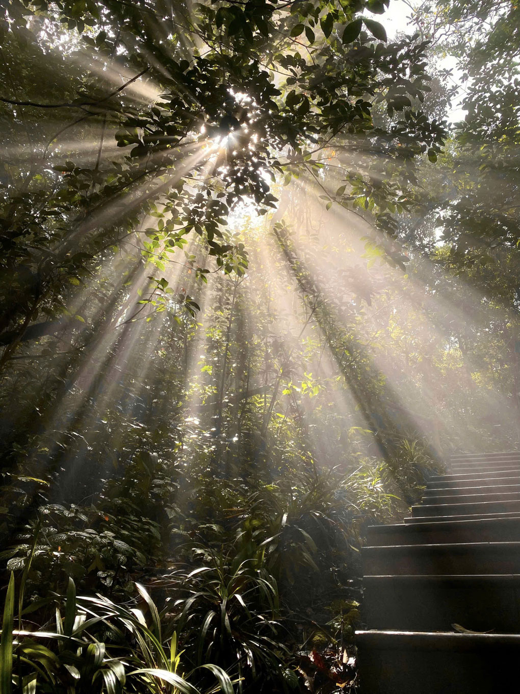 Anh không khỏi choáng ngợp trước khung cảnh bình minh nơi đây, khi ánh nắng mặt trời xuyên qua từng lớp mây trắng bồng bềnh, tạo nên khoảnh khắc thiên nhiên kỳ diệu.